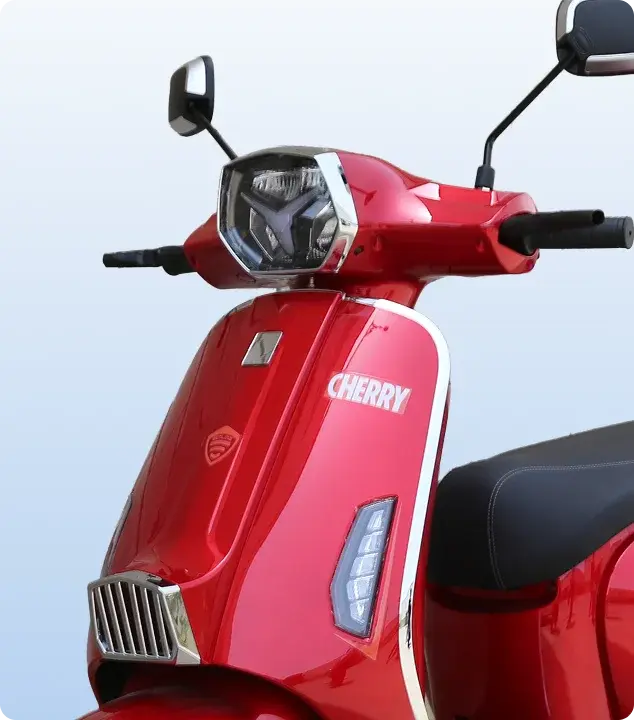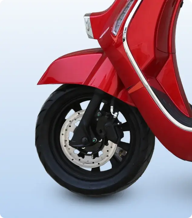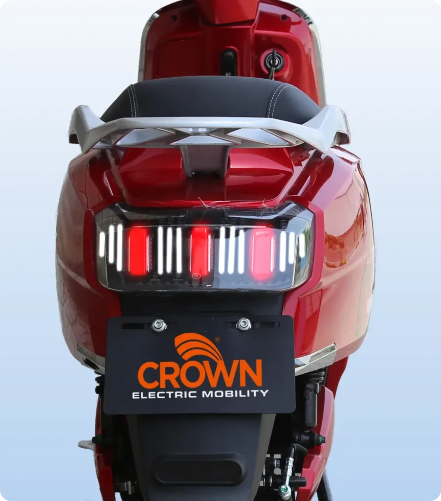 The Crown Cherry’s rear features a striking LED tail light cluster that ensures high visibility day or night. With integrated brake lights and turn indicators, it enhances safety while maintaining the scooter’s sleek profile