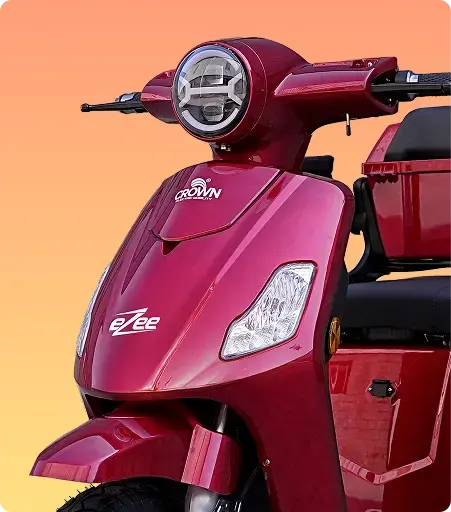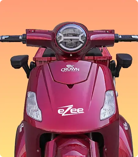 The Crown Electric Ezee features a bold front design with sleek contours and integrated LED lights, combining functional elegance with urban practicality, delivering a confident presence on the road while ensuring smooth, stable rides for everyday commuting